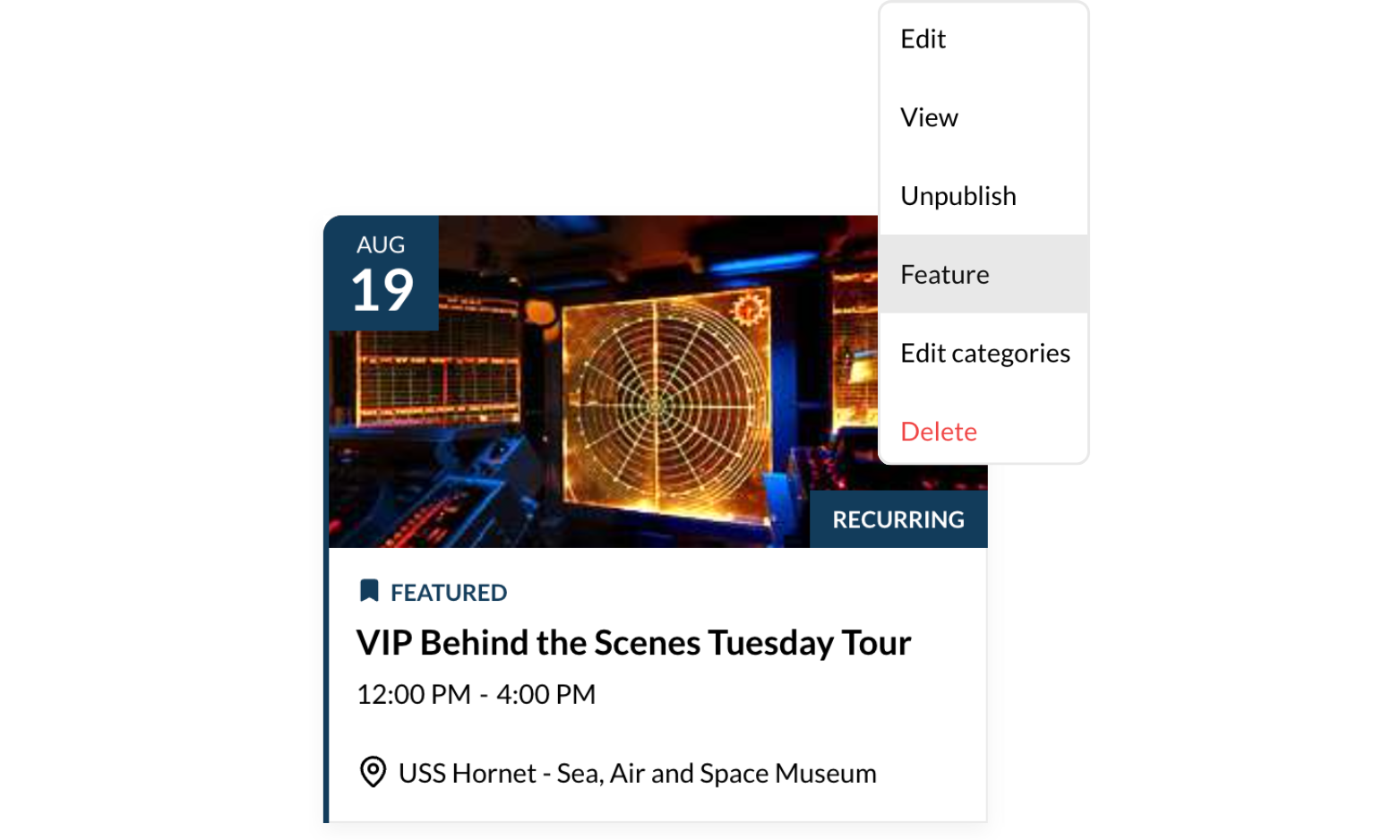 You can now feature any event from the Manage Events page in your dashboard by clicking the “…” menu and selecting Feature. Once featured, the event: