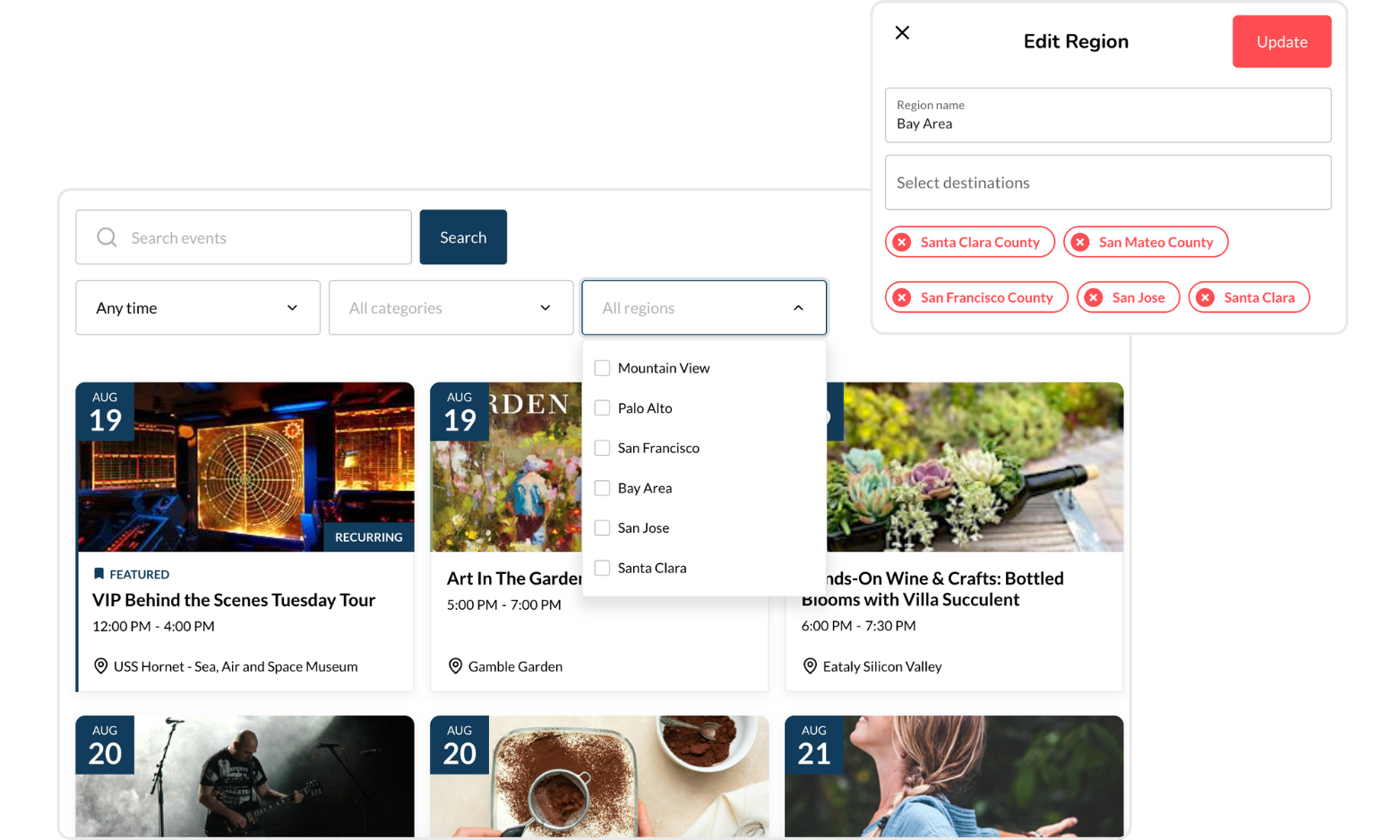 Communities often span multiple cities, and visitors want quick ways to find what’s relevant to them. That’s why we’ve introduced a Region filter to the calendar—making it easy to filter by city or by custom regions you create.